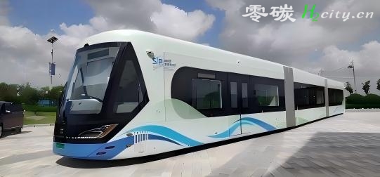 射阳港低(零)碳产业研究院门前的“零碳巴士”。图片来源/新华网