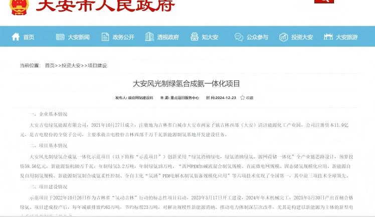 大安项目是国家清洁低碳氢能示范工程和战略性新兴产业百大工程,于2023年5月开工,新能源装机800兆瓦(风电700兆瓦,光伏100兆瓦),年制绿氢3.2万吨,绿氢制绿氨18万吨。投产后,每年可减少碳排放约65万吨,节约标煤约23万吨,相当于可抵消近50万户普通家庭一年生活用电产生的碳排放。