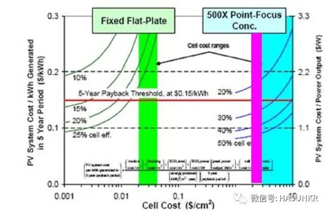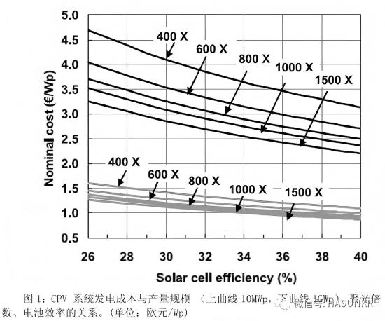 使用RXI光学聚光器1000倍聚光,使用GaAs单结电池(25%);使用高效率高倍聚光系统实现了商业光伏系统安装(10MWp)成本为2.8欧元/Wp,另外,如果加上其他不过预期的成本估算为4.8欧元/Wp,由此可见,发达国家对于CPV的重视程度。