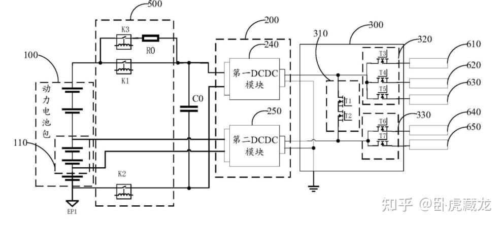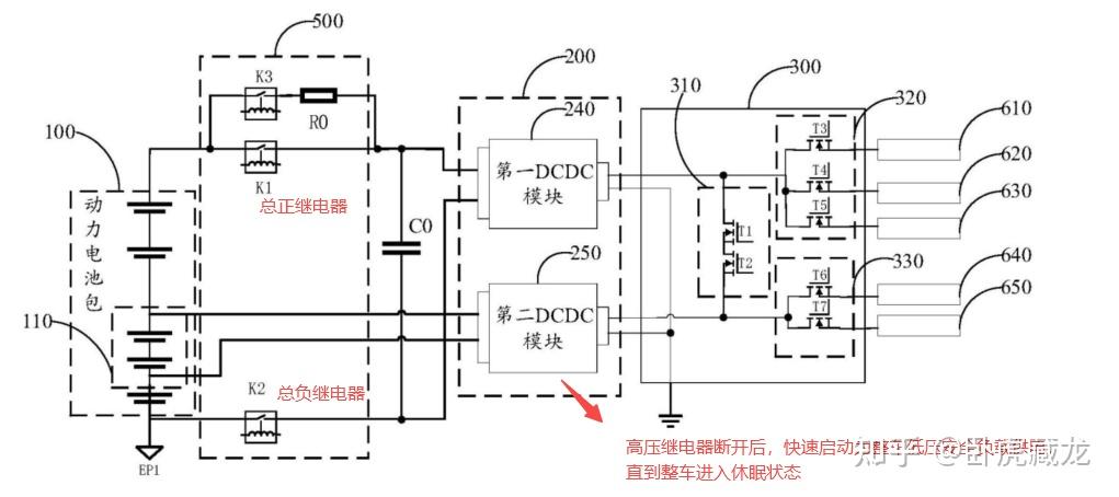 宁德方案中,主控电路先断开总正继电器 K1、总负继电器 K2(下图中电池管理电路 500),切断高压输出,随后控制第二 DCDC 模块 250(下图中独立 DCDC 模块方案)启动,由电池组 110 继续为低压负载(如车机、氛围灯)供电,直至整车进入休眠状态。