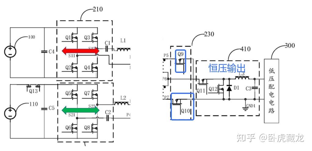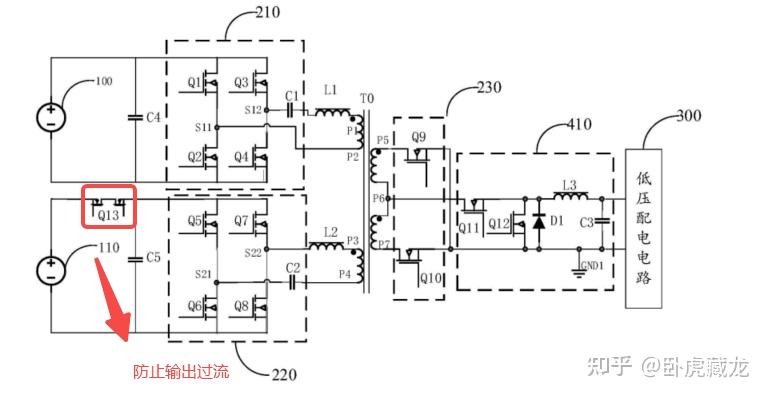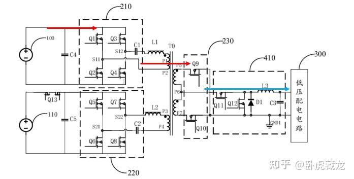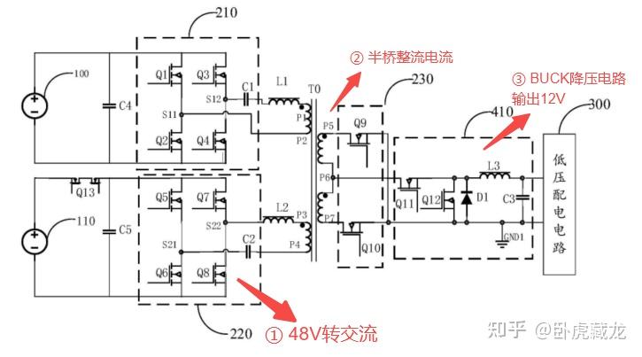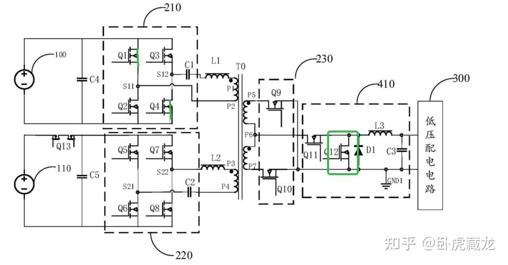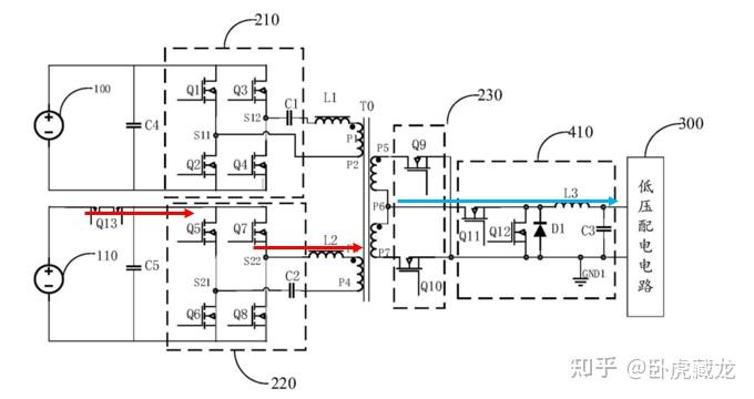 第三电压转换电路 230:半桥整流电路(Q9-Q10),配合 BUCK 电路 410(Q11-Q12、L3)实现低压恒压输出(12V±0.5V),满足车载电子设备电压精度要求。
