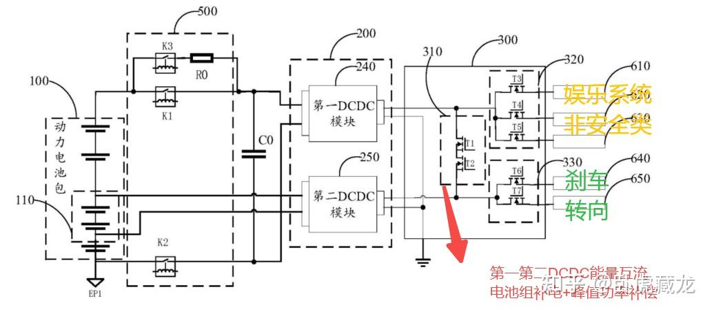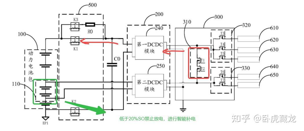 ③ 电池组补电时:动力电池包 100→第一 DCDC 模块 240→低压配电电路 300→第二 DCDC 模块 250→电池组 110(双 DCDC 模块方案)。