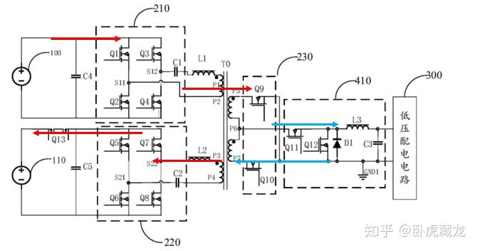 ① 高压正常时:动力电池包 100→第一电压转换电路 210→变压器第一绕组→第三 / 第四绕组→第三电压转换电路 230→低压配电电路 300(主供电路径)。