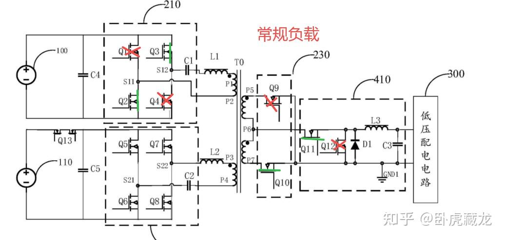 ① 第一工作模式(低压配电为主):Q2、Q3、Q10、Q11 导通,Q1、Q4、Q9、Q12 关断(图 3),适用于常规负载场景。
