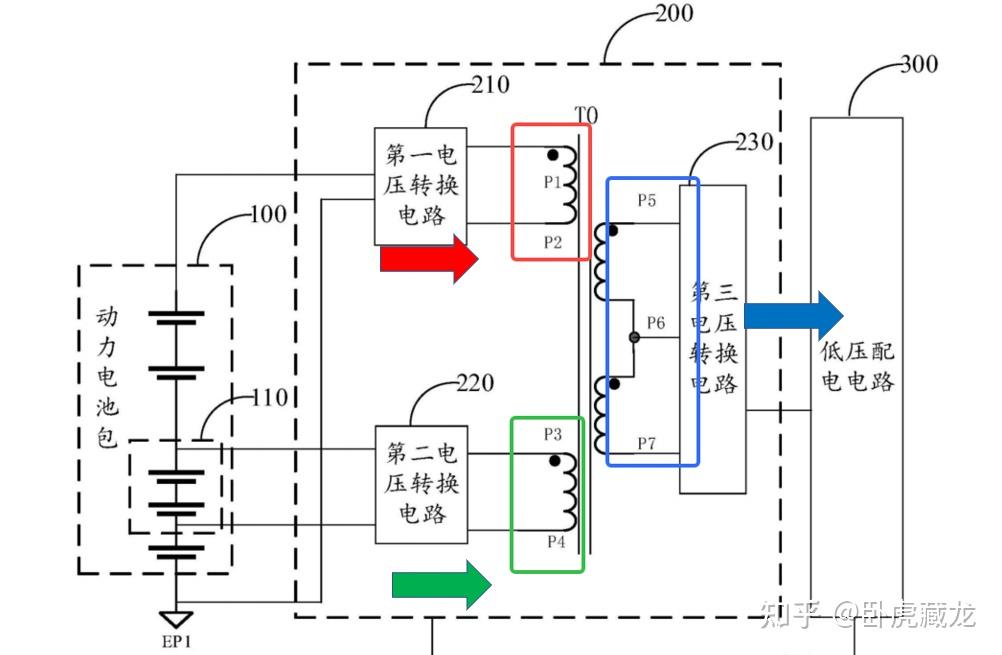 包含第一绕组(P1-P2,连接动力电池包 100)、第二绕组(P3-P4,连接电池组 110)、第三 + 第四绕组(P5-P6-P7,并联后连接低压配电电路 300)。