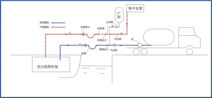 目前甲醇加注方式主要有船对船加注、趸船对船加注、岸站对船加注以及槽罐加注车对船加注。其中,槽罐加注车对船加注示意图如下: