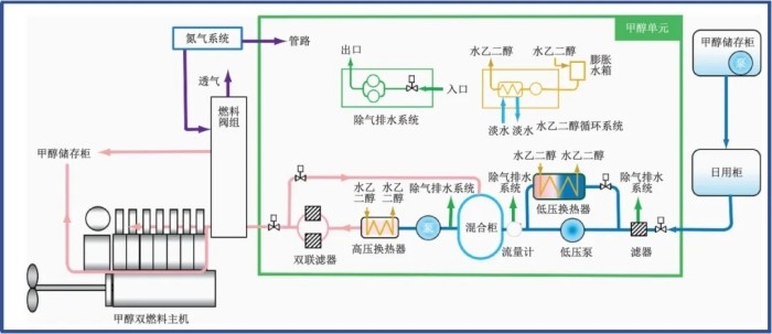 船舶通常采用的双燃料系统是其核心技术。这意味着船舶既可以使用传统的燃油,也可以使用绿色甲醇作为燃料,两种模式可以灵活切换。当使用甲醇燃料时,通过专门设计的发动机和燃料供应系统,将甲醇喷入气缸内与空气混合燃烧,产生动力推动船舶前进,整个过程由智能控制系统实时监控,确保船舶安全高效运行。