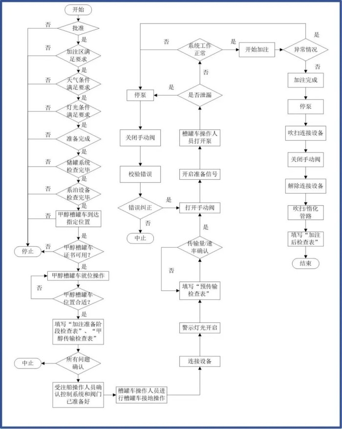 加注作业流程分为三个阶段,分别是准备阶段、加注阶段以及完成阶段。准备阶段包括兼容性评估、加注条件确认、加注双方就加注作业计划达成一致后开始加注系统连接、ERS/ESD系统测试,然后开始加注管路惰化,正式开始加注作业,加注作业中应始终关注加注双方燃料舱及液货舱压力、液位等信息,同时注意加注过程中甲醇蒸汽及氮气混合气的处理,完成阶段主要为加注完成后进行管路惰化,填写加注后检查表后断开连接管路及通讯设施。