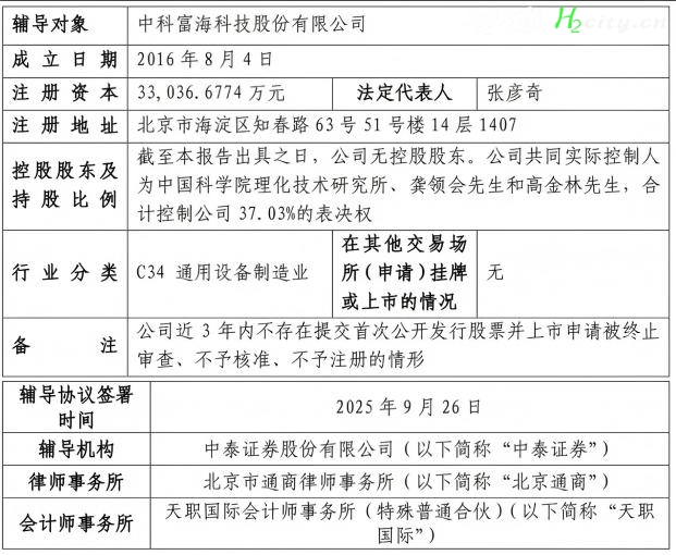 10月13日,中科富海科技股份有限公司在北京证监局办理辅导备案登记,拟首次公开发行股票并上市,辅导券商为中泰证券,律所及会计师事务所分别为北京通商、天职国际。