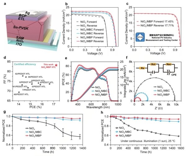 创纪录效率与优异稳定性:小面积TPSCs效率达17.89%(认证17.71%),为当前最高;器件在1344小时环境储存与1550小时连续光照下分别保持95%与94%以上效率,稳定性显著提升。