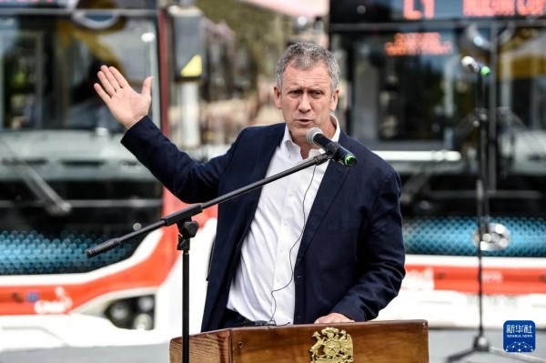 10月16日,在智利科皮亚波,智利交通和电信部长胡安·卡洛斯·穆尼奥斯在新能源公交车辆启用仪式上讲话。新华社发(豪尔赫·比列加斯摄)