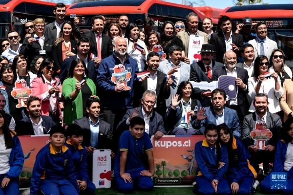 10月16日,在智利科皮亚波,人们在新能源公交车辆启用仪式上合影。新华社发(豪尔赫·比列加斯摄)