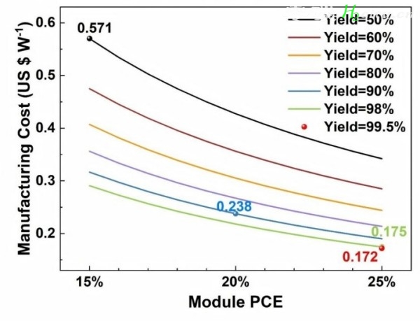 (3)过低的组件效率和制造良率:当前商业组件仅约15%效率,远低于商业晶硅组件,同时由于产线缺乏大规模生产经验、工艺标准化缺失,良率仅约50%,显著摊薄了单瓦制造成本。效率决定了成本上限,良率主导了成本下限。成本的降低需要效率和良率的协同调控。