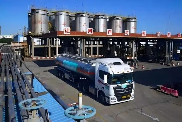 装载着中国石化1号生物航煤的油罐车由镇海炼化出厂
