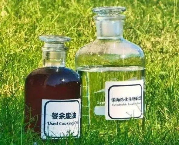 炼化前的餐余废油和镇海炼化生产的航空燃料对比