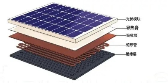背面供热:光伏板工作时会发热(尤其是大太阳下,晒得滚烫),这些热量被板子背面的热交换器(可能是铜管、铝片,或者空气通道)"抓"住,通过管道里的液体(水或者防冻液)或者直接加热空气,把热量送到家里的储水箱或者暖气片里。