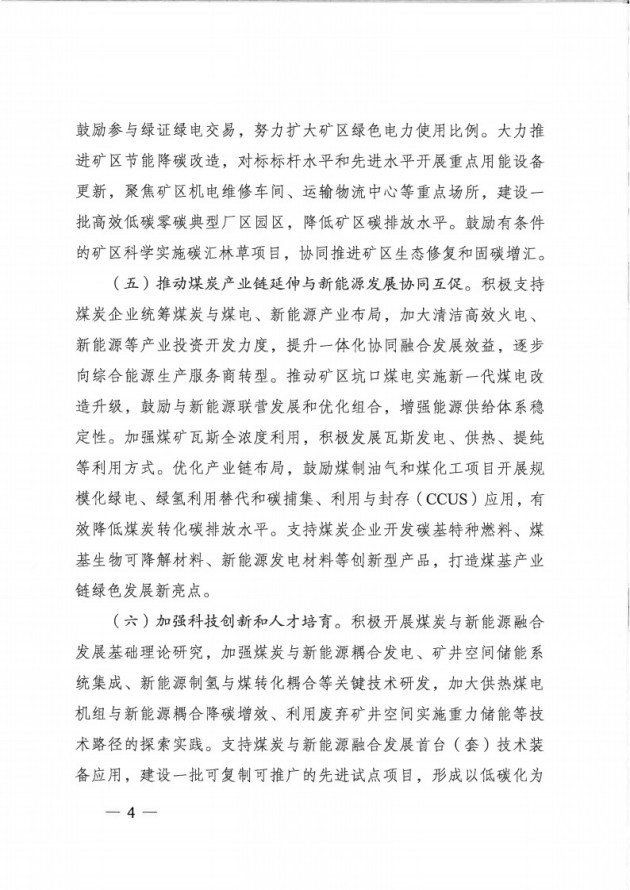 加强科技创新和人才培育。积极开展煤炭与新能源融合发展基础理论研究,加强煤炭与新能源耦合发电、矿井空间储能系统集成、新能源制氢与煤转化耦合等关键技术研发,加大供热煤电机组与新能源耦合降碳增效、利用废弃矿井空间实施重力储能等技术路径的探索实践。支持煤炭与新能源融合发展首台(套)技术装备应用,建设一批可复制可推广的先进试点项目,形成以低碳化为导向的煤基科技成果转化模式。加大煤炭企业新能源领域人才培养力度,鼓励以开设订单班、联合培养等形式按需培养一批专业型、复合型人才,支持煤炭企业与新能源企业、科研机构加强交流沟通共同提升人才创新实践能力。