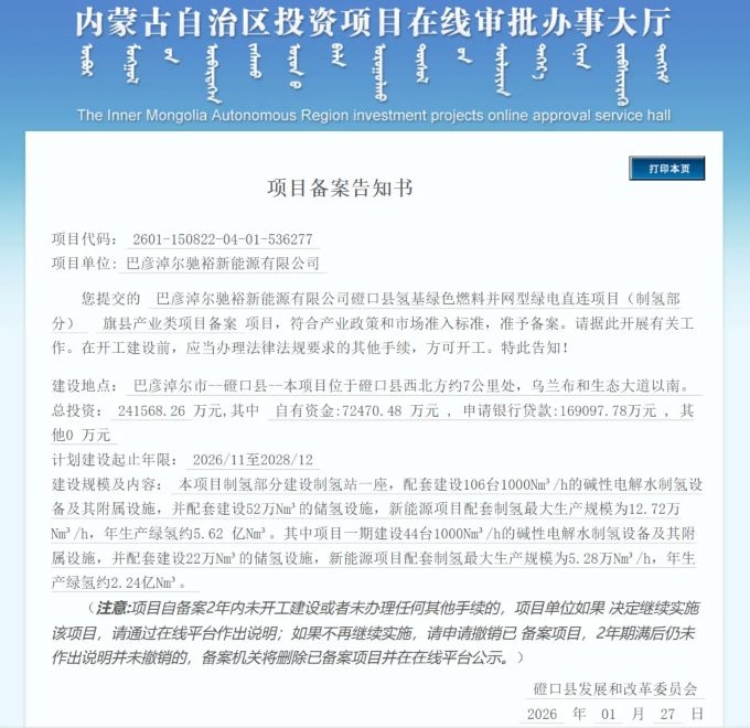 1月27日,巴彦淖尔驰裕新能源有限公司磴口县氢基绿色燃料并网型绿电直连项目(制氢部分)获批。