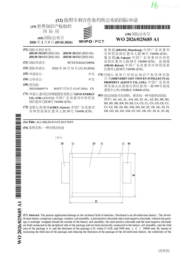 证券之星消息,根据企查查数据显示亿纬锂能(300014)公布了一项国际专利申请,专利名为“一种全固态电池”,专利申请号为PCT/CN2024/128906,国际公布日为2026年2月5日。