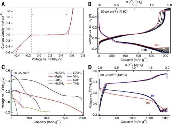 图3、固态电解质的电化学稳定窗口,Ti/TiH2电池的可逆运行曲线,以及不同金属氢化物的电化学性能 © 2025 AAAS