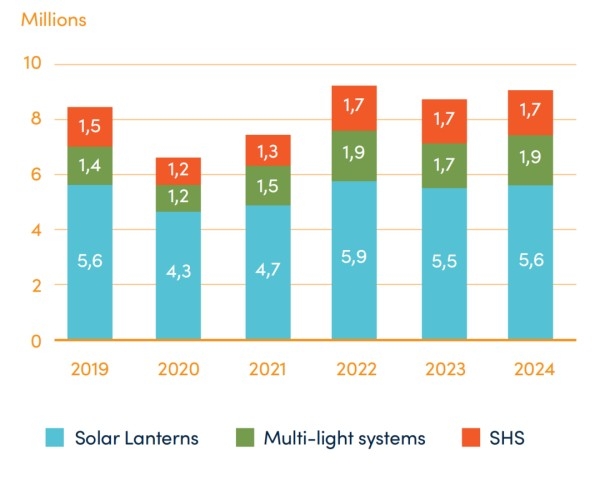 家庭太阳能系统(SHS) 则销售了 170 万件,略微下降了 1%。