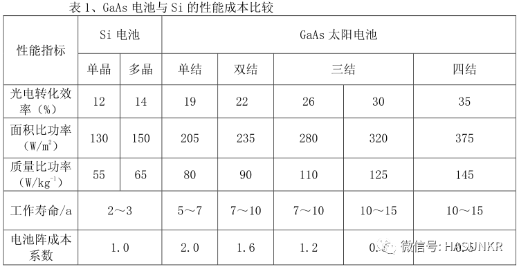 下表表示GaAs电池(非聚光)与Si的性能成本比较