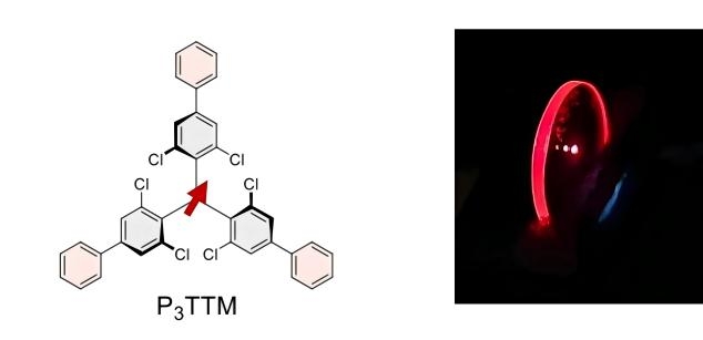P3TTM 的化学结构旁边是 P3TTM 薄膜的发光照片:薄膜从自由基双重激发态发出红光。
