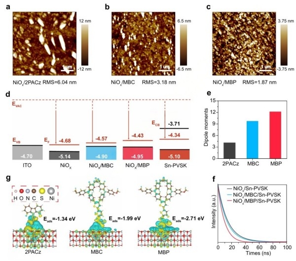 新型分子MBP实现均匀界面与能级对齐:MBP在NiOₓ表面形成超平整分子层(粗糙度仅1.87 nm),显著提升能级匹配度与空穴提取效率,克服传统分子(如2PACz)覆盖不均的问题。