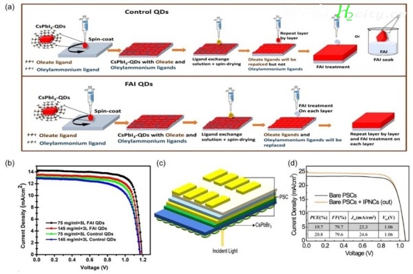 目前用纳米片做太阳能电池的研究不多,主要问题是膜厚度不够和容易相变。不过有人找到了解决办法:用醋酸铯和 HPbX3 做前驱体,做出 500nm 厚的 CsPbI3 薄膜,再加苯乙基碘化铵(PEA)形成准二维结构,抑制相变,电池效率能到 12.4%,带隙也正好适合太阳能电池。