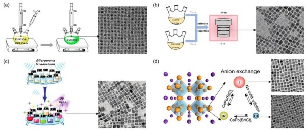 另外两种方法 ——“微波法” 和 “离子交换法” 也常用。微波法就是用微波炉加热原料,能放慢结晶速度,方便控制粒径;离子交换法更灵活,在已经做好的量子点里加不同的卤化物盐,不用改粒径和形状,就能做出不同卤素组成的量子点,比如把 CsPbBr3 改成 CsPb (Br/I) 3。
