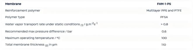 FS 膜由短侧链 PFSA 聚合物制成。这些膜在电流密度为 2 A/cm2 时可实现高达 85% 的 HHV(高热值)效率。该膜具有特别低的膨胀率和优异的强度特性。