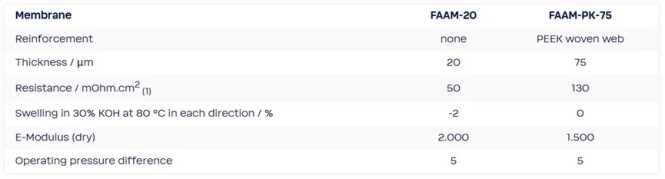FAAM膜由含有杂原子的多芳烃制成。这些膜在电流密度为 0.8 A/cm2 时促进了高达 85% 的 HHV 效率。该膜的特点是溶胀率特别低,强度性能优异。