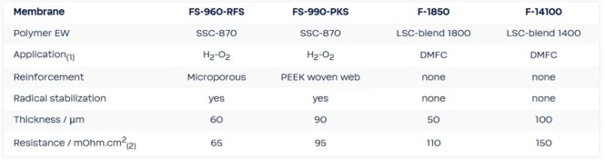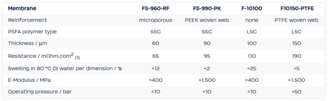 F 膜由长侧链 PFSA 聚合物制成。这些膜有增强膜或非增强膜两种形式。非增强膜在性能方面可与 FS 离聚物相媲美。膜 F-10150-PTFE 用于布置压力作极限上限的单元。