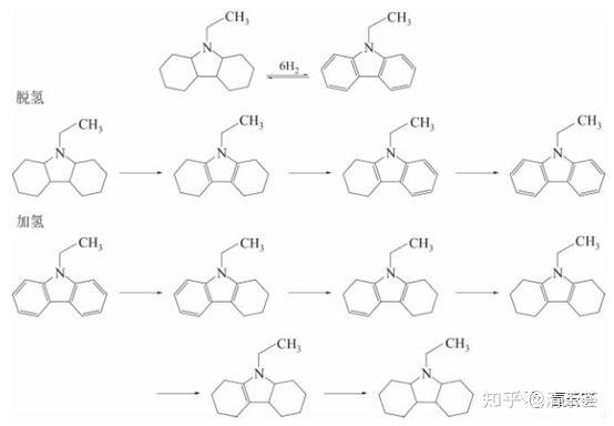 传统有机液体氢化物难以实现低温脱氢,导致难以大规模应用和发展。因此有人提出用不饱和芳香杂环有机物作为新型储氢介质,其中咔唑和乙基咔唑是典型代表。咔唑主要存在煤焦油中,可通过精馏或萃取等方法得到,常温下为片状结晶。研究表明咔唑可在250℃下加氢、在220℃下脱氢。乙基咔唑常温常压下也是无色片状晶体,可以在130℃~150℃下快速加氢,在150℃~170℃下脱氢,是较为理想的储氢介质。国内氢阳能源的液态有机储氢技术很可能采用了乙基咔唑作为储氢介质。