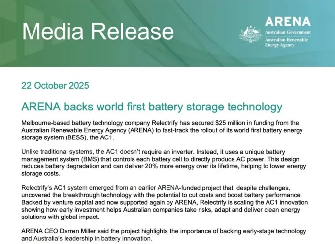 最近,澳大利亚可再生能源署(ARENA)宣布,向总部位于墨尔本的电池技术公司Relectrify提供2500万澳元资金,用来推动AC1储能系统的商业化,这笔投资被认为是ARENA在“储能架构创新”上的一次重注。