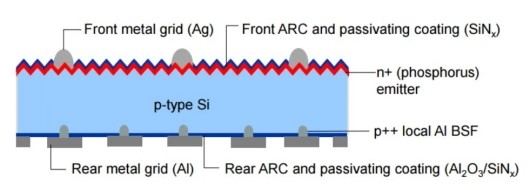 7、Rear ARC and passivating coating(Al2O3/SiNx):背钝化层,Al2O3带负电,可作为P型的背钝化层,抑制电子