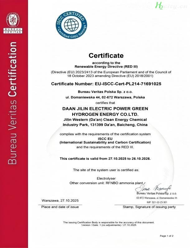 10 月 29 日,国家电力投资集团有限公司(以下简称 “国家电投”)开发的吉林大安风光制绿氢合成氨一体化示范项目(一期)通过了国际可持续发展和碳认证系统(ISCC EU)审核,获得全球首张 “非生物来源可再生燃料氨” 认证证书。这不仅标志着国家电投在绿色氢基能源产业取得了新突破,也意味着中国在该领域的技术与方案得到了国际认可。