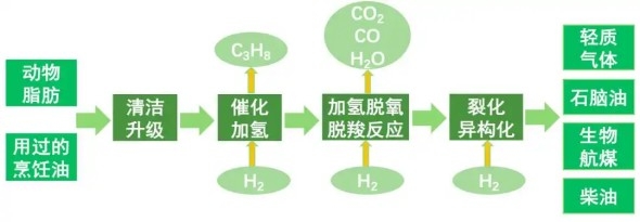 酯及脂肪酸加氢工艺(HEFA)是一种对植物油、餐饮废油和动物脂肪中的甘油三酯、饱和及不饱和脂肪酸加氢处理的过程。该工艺大体上分为3步: