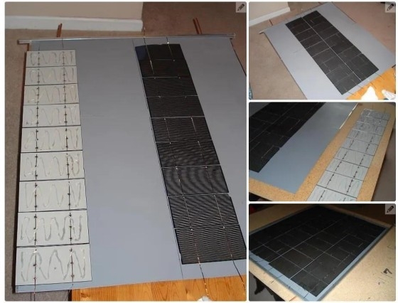 太阳能电池特别薄(0.2mm,比纸还薄!),作者用导热硅胶(Begquist sil-pad 400)把电池粘在绝缘材料上(防止短路),再把电池一片片串起来(像串糖葫芦),最后粘到铝背板上。