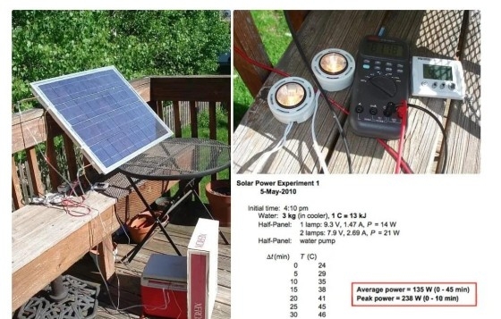 电池串好后,接上电线(注意正负极别接反!),再接上12V水泵(用来循环铜管里的水)。作者先在冬天测试(大太阳少),发现: