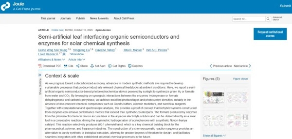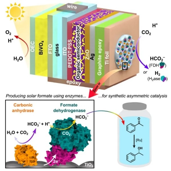 化学工业是全球经济的重要基石之一,生产各种商品——从药品和化肥到塑料、油漆、电子产品、清洁剂和洗漱用品。如果想要建立一个循环、可持续的经济,化学工业是一个必须解决的大而复杂的问题,必须想出办法使这个重要行业去化石化。 剑桥大学的研究人员设计了一种太阳能“人造叶子”,可以模仿光合作用,以可持续的方式制造有价值的化学物质。他们的生物混合设备结合了有机半导体和酶,将二氧化碳和阳光高效转化为甲酸盐,为更绿色的化学工业铺平了道路。 该研究发表在《焦耳》杂志上,文章标题为“Semi-artificial leaf interfacing organic semiconductors and enzymes for solar chemical synthesis”。 甲酸盐的价值 在繁多的化工商品中,甲酸以其独特性质脱颖而出。它常温常压下为液体,便于储存和运输,且作为最简单的一元羧酸,其应用广泛。甲酸不仅是基本有机化工原料,还广泛应用于农药、皮革、染料、医药和橡胶等多个行业。 甲酸盐的应用也极为广泛。在畜牧业中,它可作为有效的食品防腐剂,帮助抑制细菌的生长。而在饲料行业,二甲酸钾的崛起更是引人注目,被誉为“代替抗生素促进动物生长的首选饲料添加剂”,预示着其巨大的市场潜力。此外,甲酸盐在化工领域也扮演着重要角色,作为C1建构模块,它能够催化还原特定官能团,如参与不饱和基团的氢化反应等。同时,甲酸盐在制革、制药工程、橡胶制造乃至钻井行业中都有其独特的用途。值得一提的是,甲酸盐还具备作为清洁燃料的潜力,其氢质量分数达到4.4%,容积容量更是高达53g H2 L–1,能量密度超越了商用70 MPa储氢罐,为直接甲酸盐燃料电池提供了理想的液相储氢介质。据资料预测,2025年甲酸盐的市场容量有望达到8281亿美元。‘ 人造叶子 剑桥大学的研究人员的突破涉及一种混合设备,该设备将光吸收有机聚合物和细菌酶结合在一起,将阳光、水和二氧化碳转化为甲酸盐,甲酸盐是一种清洁燃料,可以为额外的化学反应提供动力。根据《焦耳》杂志发表的研究结果,这标志着有机半导体首次在这种生物混合系统中充当光捕获组件,为新一代环保人造树叶铺平了道路。 这种“半人造叶子”复制了光合作用,这是植物用来将阳光转化为能量的自然过程,并且完全依靠自身力量运行。与以前依赖有毒或不稳定的光吸收剂的设计不同,这种新的生物混合模型使用无毒材料,运行效率更高,并且无需额外添加剂即可保持稳定。 在实验室测试中,该团队成功地利用阳光将二氧化碳转化为甲酸盐,然后直接将其应用于“多米诺骨牌”反应,合成了一种用于药物的有价值的化合物,实现了高产量和纯度。 运行中的半人工有机光电阴极(前视图) 这个研究团队专门研究人造树叶的开发,这种树叶可以在不依赖化石燃料的情况下将阳光转化为碳基燃料和化学品。但他们早期的许多设计都依赖于合成催化剂或无机半导体,它们要么快速降解,要么浪费大部分太阳光谱,要么含有铅等有毒元素。而新开发的设备结合了两全其美的优点——有机半导体可调且无毒,而生物催化剂具有高度选择性和效率。 技术概念图 新设备将有机半导体与硫酸盐还原细菌的酶集成在一起,将水分解成氢气和氧气,或将二氧化碳转化为甲酸盐。 研究人员还解决了一个长期存在的挑战:大多数系统需要化学添加剂(称为缓冲液)来保持酶的运行。这些会迅速分解并限制稳定性。通过将辅助酶碳酸酐酶嵌入多孔二氧化钛结构中,研究人员使该系统能够在简单的碳酸氢盐溶液(类似于苏打水)中工作,而无需不可持续的添加剂。