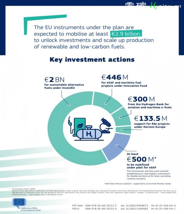 此外,委员会计划在2025年底前追加3亿欧元专项资金,用于氢气生产,直接服务于氢基SAF和可持续海洋燃料的规模化制造。
