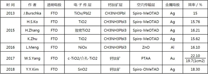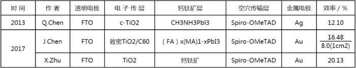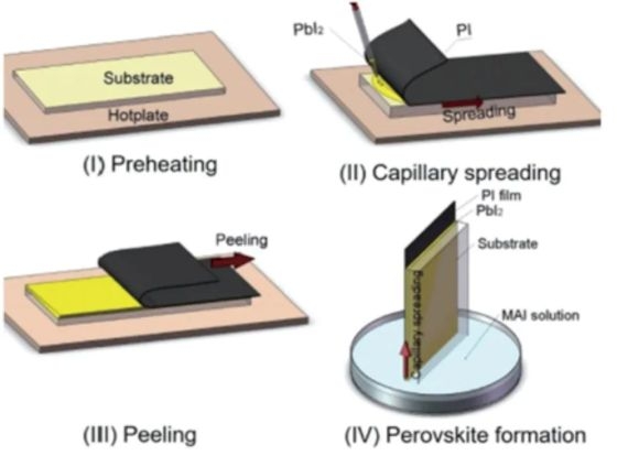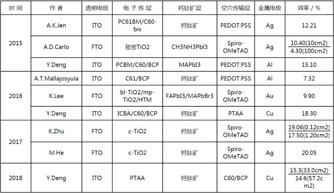 中南大学 Yang 等基于简单 平面异质结构 ITO/ PEDOT:PSS / MAPbI3/PCBM/Ag,利用刮涂技术制备了效率为 11.29%的钙钛矿太阳电池器件, 认为可以同卷到卷工艺匹配开发大规模制造方案。该团队开发卷到卷全印刷钙钛矿太阳电池,获得 11.96%的转换效率。