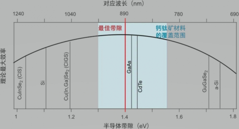 第一代单晶硅太阳能电池的制备要求纯度高达99.99%,生产过程复杂且能耗高、污染大;第二代薄膜太阳能电池的生产能耗成本虽然有下降,但仍需要依赖铜、铟等贵金属,而且还伴随有剧毒的副产物产生。钙钛矿太阳能电池大多采用溶剂工艺,其原料多为液态,能在常温下制备,是目前唯一采用溶液法就可以得到的高质量半导体。钙钛矿具有激子寿命长、缺陷浓度小、可见光区吸光度高原料易得等优异性质,可以与晶体硅电池叠加制成叠层电池。由于钙钛矿材料一般具有比较低的载流子复合几率和比较高的载流子迁移率,使得其能够获得较长的载流子的扩散距离和寿命,因而钙钛矿太阳能电池具备获得更高的光电转换效率的理论支持。2. 带隙可调