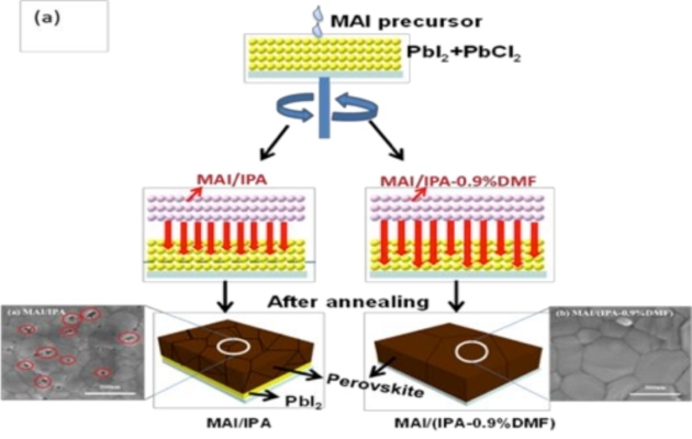 气固反应法主要包括物理气相沉积和化学气相沉积。传统的气固反应往往在高真空环境中进行, 因而受环境湿度影响较小,因此实验重现性较好,但存在真空仓易受污染的问题。该方法首先是将PbI2旋涂到70 ℃的ITO/HTL上,退火10 min; 其次,将CH3NH3I /乙醇均匀地喷涂在80 ℃的基底表面; 最后,两个基底扣合在真空干燥器中,利用化学气相沉积形成钙钛矿薄膜。