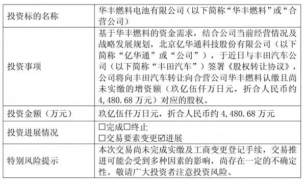2021年6月,华丰燃料电池有限公司由北京亿华通科技股份有限公司和丰田汽车公司共同出资组建,双方各持股50%,公司致力于通过生产及销售“联合燃料电池系统研发(北京)有限公司”开发的燃料电池系统从而普及FCEV,为实现“氢能社会”及“环保移动社会”做出贡献。