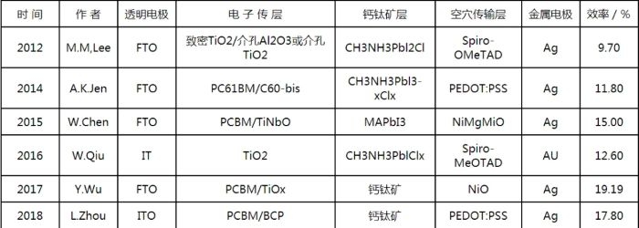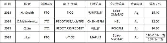 中南大学 Yang 等基于简单 平面异质结构 ITO/ PEDOT:PSS / MAPbI3/PCBM/Ag,利用刮涂技术制备了效率为 11.29%的钙钛矿太阳电池器件, 认为可以同卷到卷工艺匹配开发大规模制造方案。该团队开发卷到卷全印刷钙钛矿太阳电池,获得 11.96%的转换效率。