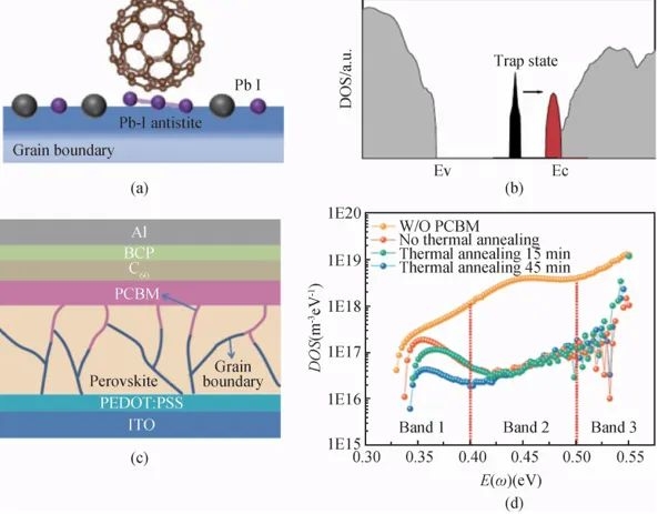 有机无机杂化钙钛矿太阳能电池具有极低制造成本和高功率转换效率的特点,发展前景广阔。薄膜缺陷长期制约钙钛矿太阳能电池光电转换效率和器件稳定性的发展,因此,必须深化认识钙钛矿薄膜内部缺陷、 表层电子收集界面缺陷和空穴收集界面缺陷,采用针对性钝化策略缓解缺陷影响,保障器件性能。目前,针对钙钛矿薄膜缺陷的 钝化思路主要是在前驱液中添加钝化剂,调整钙钛矿 结晶速度增强结晶度,以及钝化晶界缺陷降低缺陷浓度和能级陷阶深度。现有钝化材料主要包括以下几种。为了钝化钙钛矿的晶界,研究者们提出了非化学计量的方法,即在前驱液中配制过量 PbI.2 或 MAI前驱体实现“自钝化”效应。碱金属元素能有效钝化钙钛矿薄膜缺陷。Lee 等发现,无添加 Na + 的钙钛矿薄膜裸露面积大,呈针状形 貌;而在 MAI. 和 PbI.2 的前驱体溶液中添加 Na +后,Na +将和 PbI.2 形成中间相,阻碍 PbI.2 结晶和抑制形成针 状钙钛矿相,从而提高钙钛矿结晶均匀性和薄膜平整度。因此,电池漏电流显著减小,Voc 由 0.87 剧增到 1.05 V;电荷传输能力增强和复合损失也有明显降低,实现 Jsc (17.13 ~19.33mA/cm2 ) 和 FF(68.08% ~ 74.69%)显著提高 。研究表明,K +也能起到提高薄膜平整度类似的效果 。富勒烯是一类典型的钙钛矿钝化剂材料。研究表明,PCBM可钝化 Pb-I. 的反位缺陷,形成 PCBM-卤化 物自由基 。根据密度泛函理论计算结果,当在 Pb-I. 反位缺陷附近引入 PCBM(图 (a)),PCBM与钙钛矿 表面的基态波函数杂化巨 Pb-I. 反位缺陷引起的深陷阶态将变浅(图(b))。黄劲松课题组通过热退火的方法,促使 PCBM扩散到钙钛矿薄膜的晶界和表面的缺陷处(图 ( c)),缺陷态密度降低了两个数量级(图 (d)),器件性能显著提高,并巨有效消除光电流滞后效应。路易斯酸和路易斯碱分别指的是可接受和给予电子对的物质。在钙钛矿薄膜上存在欠配位的卤化物阴 离子(路易斯碱)及 Pb 离子(路易斯酸) 。通过路易斯酸-碱络合物钝化,可降低薄膜缺陷密度,提高电池 效率及稳定性。鉴于钙钛矿薄膜表面分子具有最高的活性和扩散性,并巨更容易受到水分和氧气的侵蚀,引进疏水性材料也能较好钝化薄膜缺陷。除了通过替换材料组分或进行化学修饰从本质上提高它的耐湿性外,最常用的方法就是利用封装保护及采用疏水性电极来防止水分对器件的侵蚀。另外,光照是太阳能电池工作时不可避免的条件,工作条件下连续光照产生的热量会加速钙钛矿的分解和诱发离子迁移。离子迁移问题被认为是导致钙钛矿材料和器件性能衰减的主要原因之一。由于甲胺铅碘材料中的有机基团和卤素离子在常温下也会通过缺陷和晶界实现长距离的迁移,因此找出一种有效抑制离子迁移的方法已成为解决钙钛矿材料及器件稳定性问题的关键。于含铅材料对环境的不友好性,研究者也正在努力实现无铅化,最直接的方法是利用同族的Sn元素代替Pb元素,但相应会带来电池转换效率的降低。目前有学者提出用废弃的铅制作钙钛矿太阳能电池,以此解决废弃铅的处理难题。然而要完全实现无铅化仍然是钙钛矿太阳能电池领域一个充满挑战的事情。在过去的十年里,关于钙钛矿电池的研究发展迅猛,其光电转化效率已从初始的2.2%迅速飙升至目前的25.2%,接近硅基太阳能电池的水平。钙钛矿太阳能电池有望成为光伏舞台上的重头戏。08 钙钛矿电池的商业化尝试
