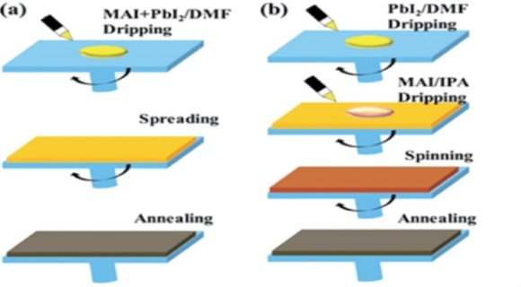 气固反应法主要包括物理气相沉积和化学气相沉积。传统的气固反应往往在高真空环境中进行, 因而受环境湿度影响较小,因此实验重现性较好,但存在真空仓易受污染的问题。该方法首先是将PbI2旋涂到70 ℃的ITO/HTL上,退火10 min; 其次,将CH3NH3I /乙醇均匀地喷涂在80 ℃的基底表面; 最后,两个基底扣合在真空干燥器中,利用化学气相沉积形成钙钛矿薄膜。