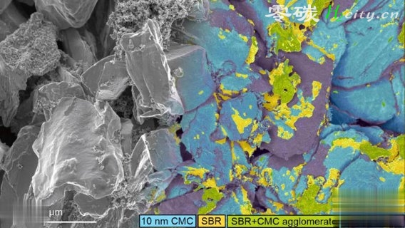 通过可视化分析,研究者观察到一个此前被忽视的现象:在电极制造过程中,起初均匀包覆在石墨颗粒上的CMC粘结剂层,在搅拌和干燥工序中会发生断裂和聚集,形成厚薄不均的碎片化分布。这种不均匀分布会在电极局部造成离子传输瓶颈,显著影响充电速度和长期循环稳定性。